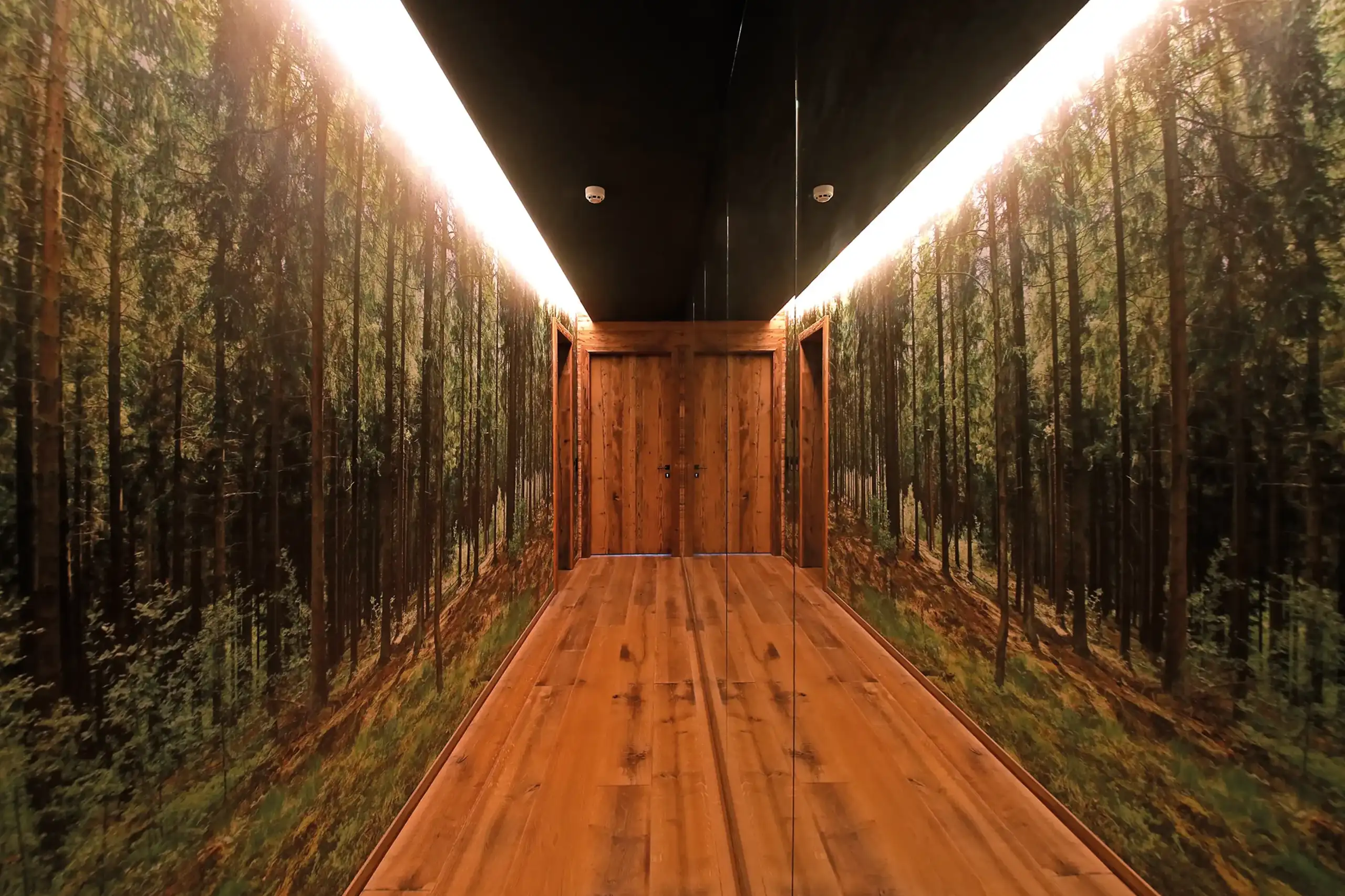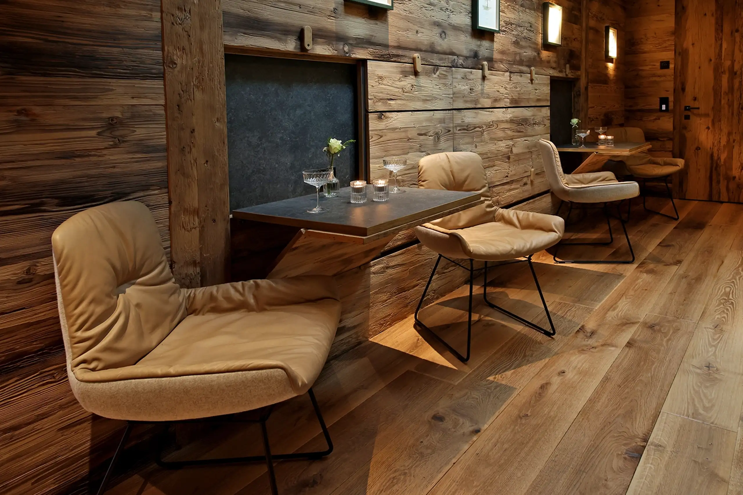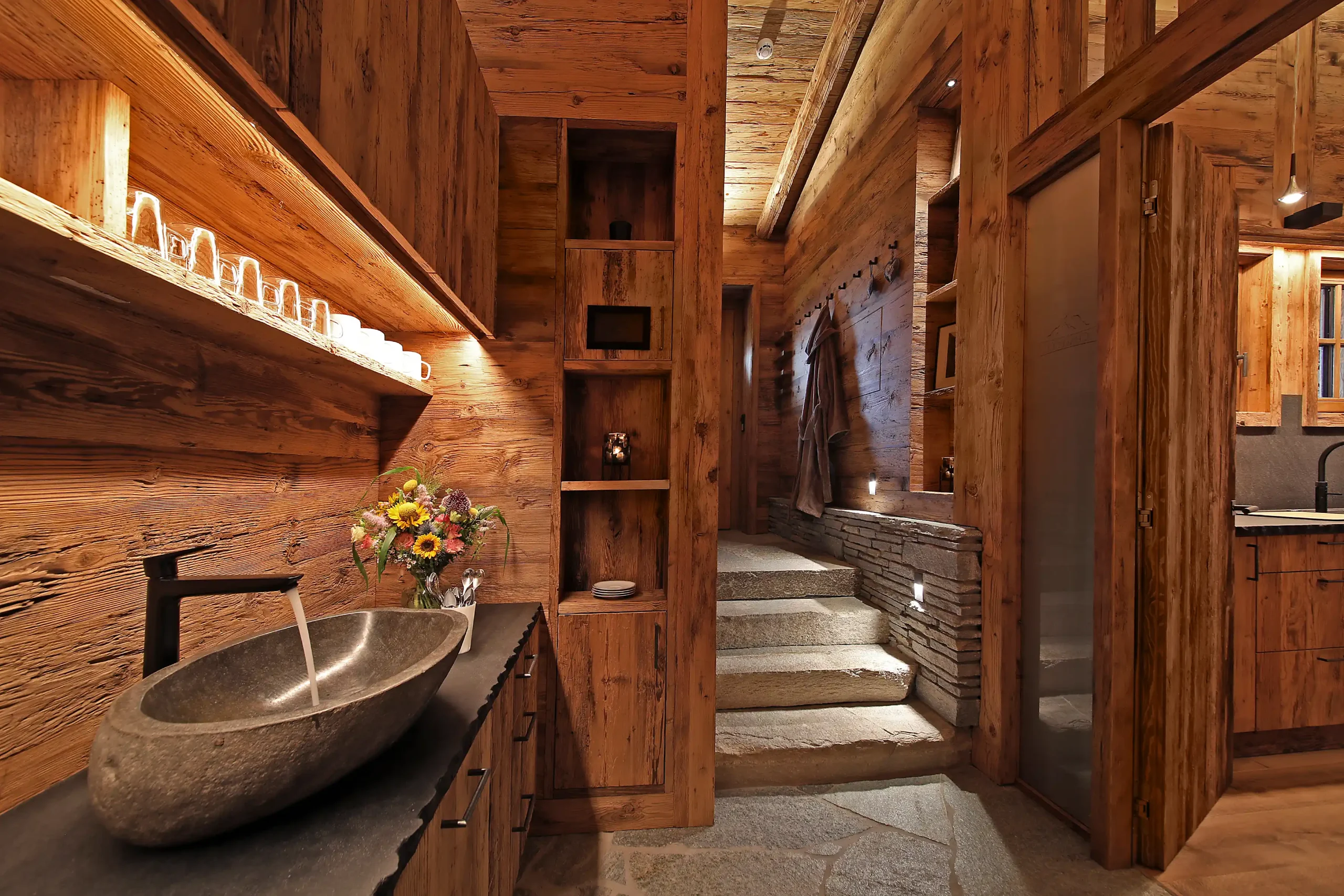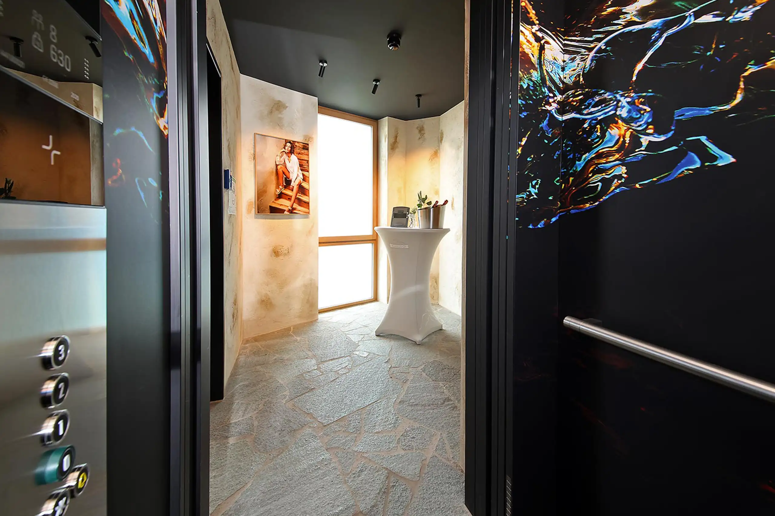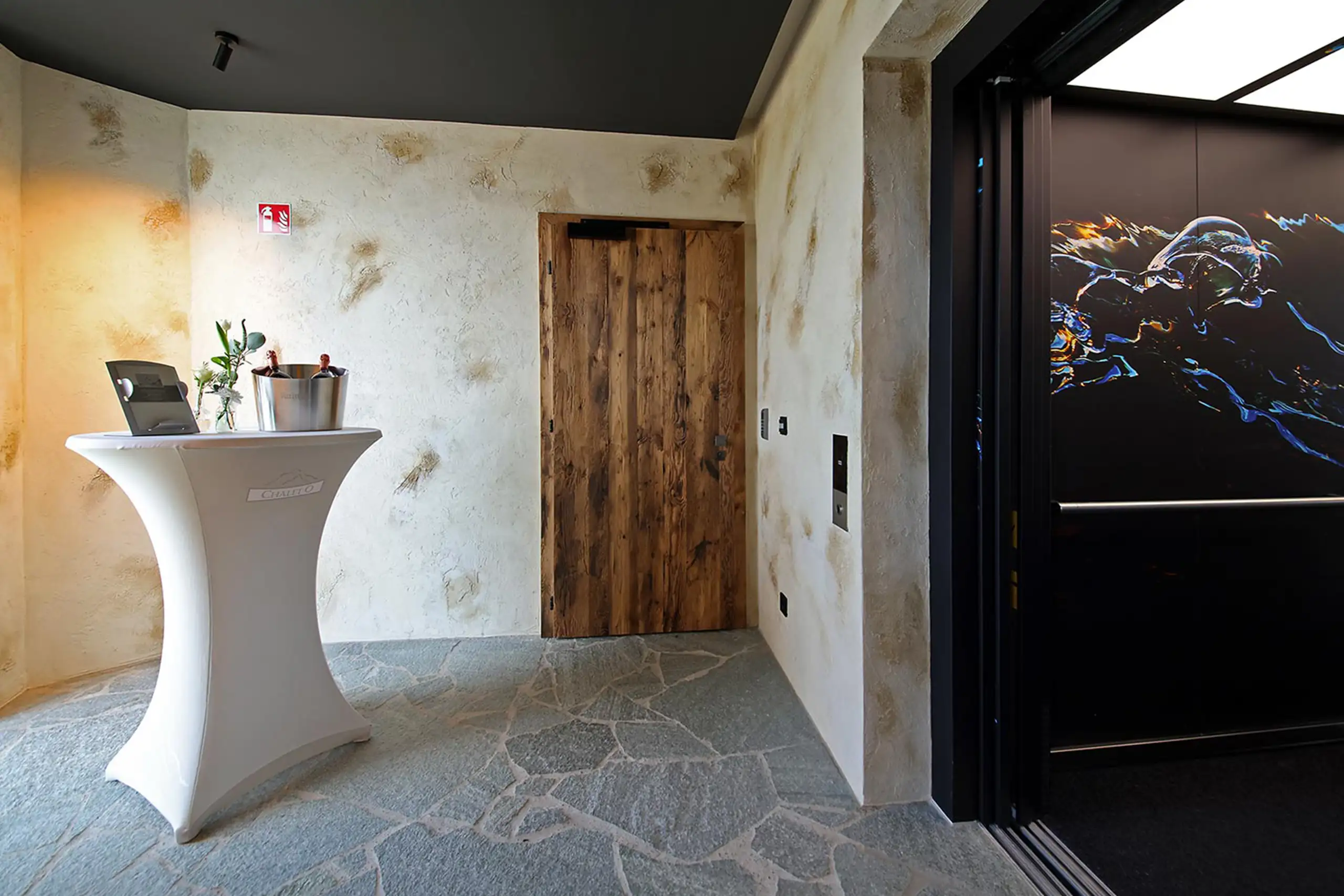 Der Willkommens- und Buffetbereich bietet eine elegante Garderobe und fünf in der Wand versteckte Klapptische. Es gibt Zugang zum Fitnessraum, WC und zur Berghütte im oberen Geschoss.