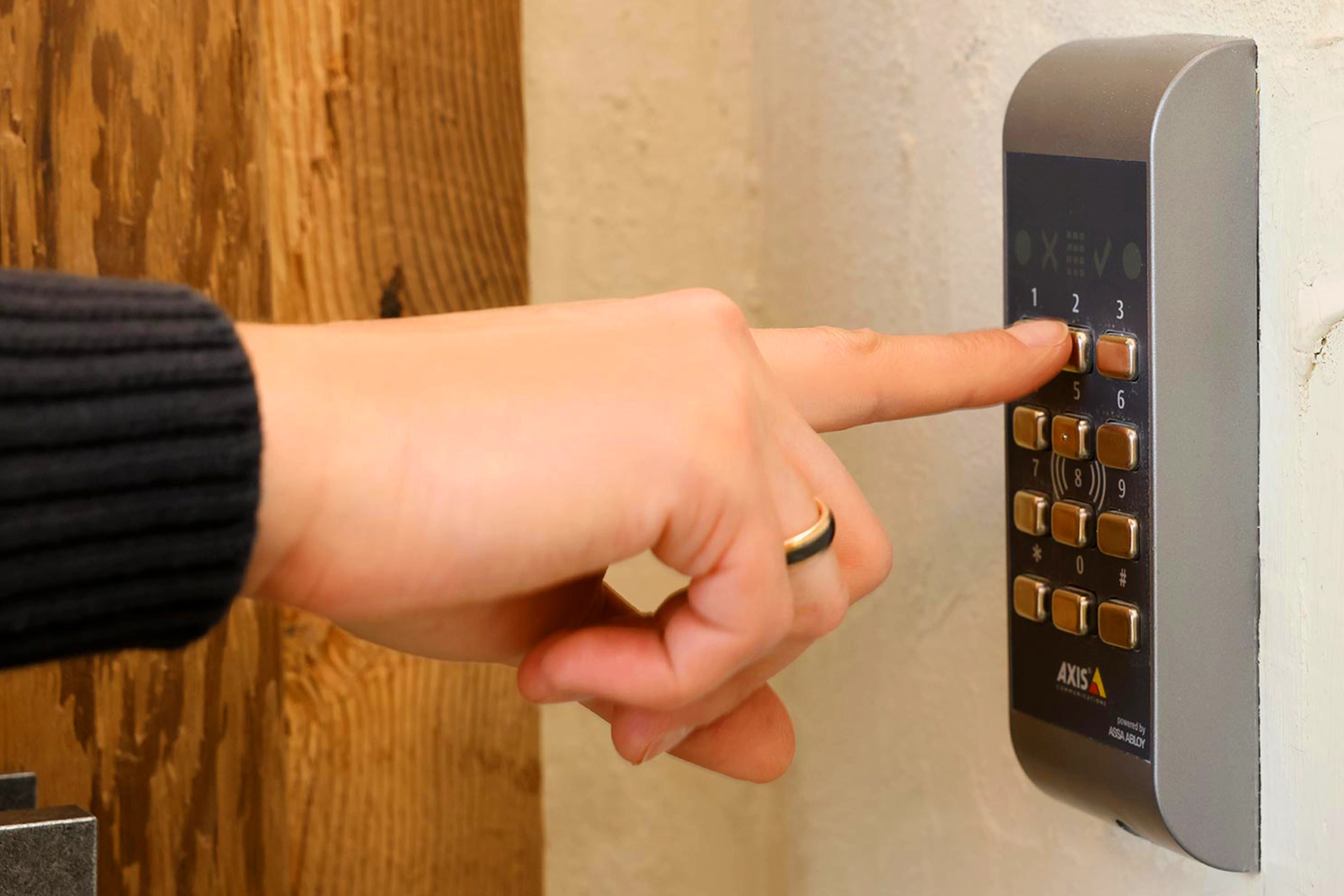 Der Haupteingang bietet einen großzügigen Empfangsbereich und ist über einen Fahrstuhl zugänglich. Der Zutritt erfolgt durch zeitlich personalisierte Codes.